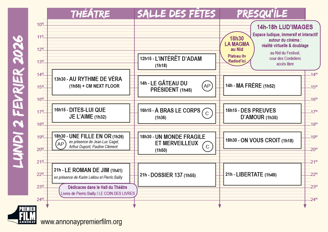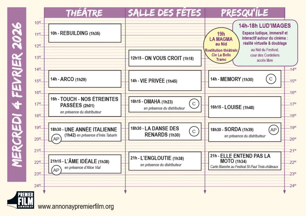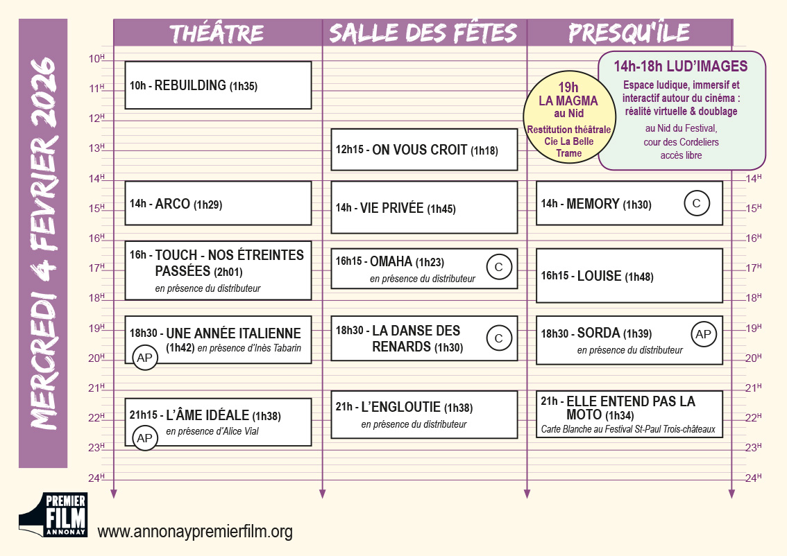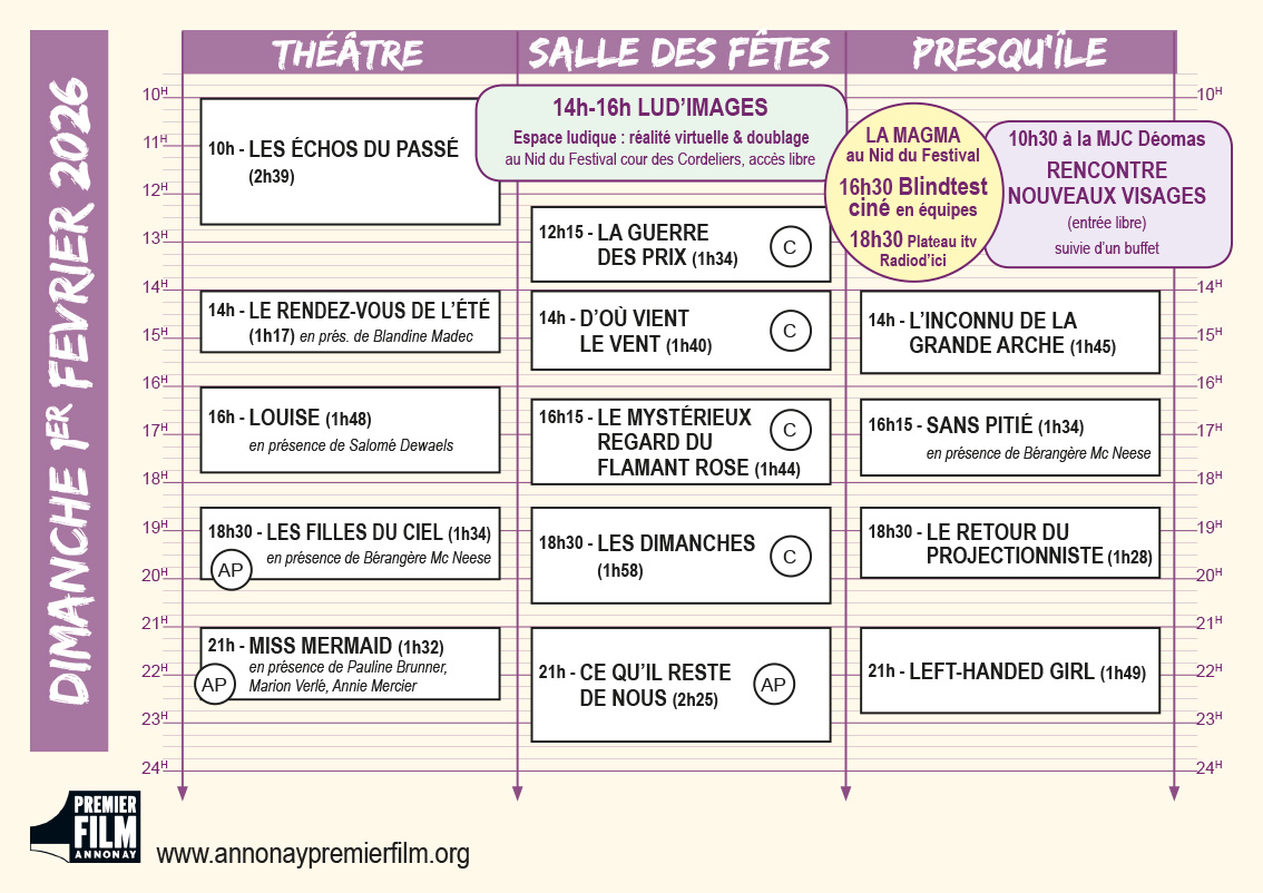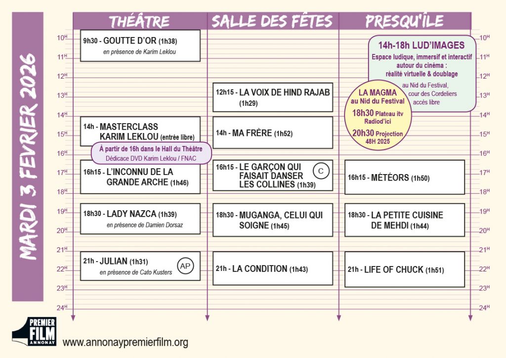 Vous en trouverez une version papier dans les lieux de projection et au Nid du Festival dans la cour des Cordeliers jouxtant le théâtre, elle permet de visualiser en un coup d’œil la programmation du jour !