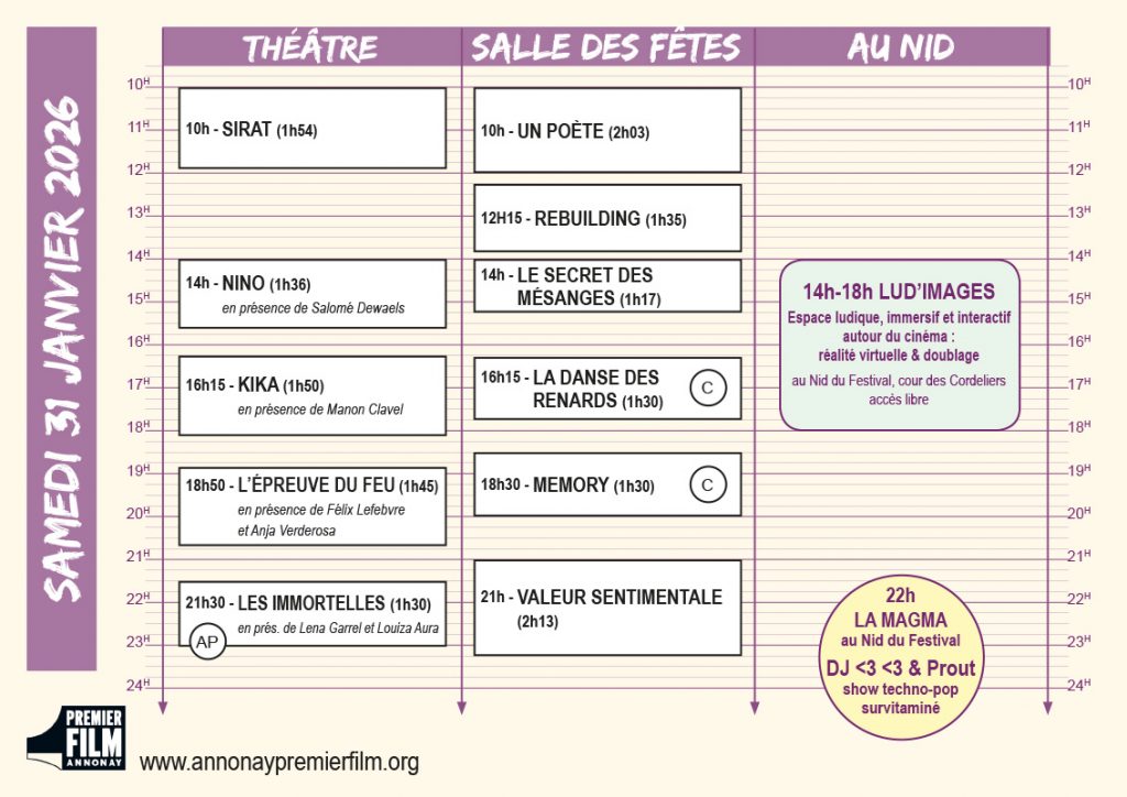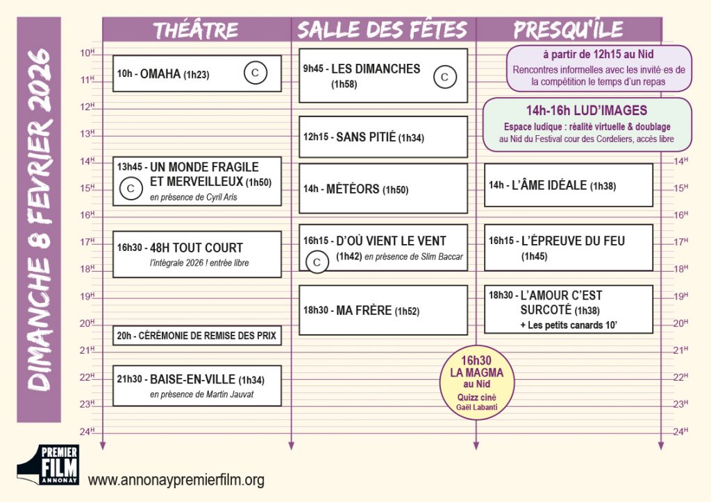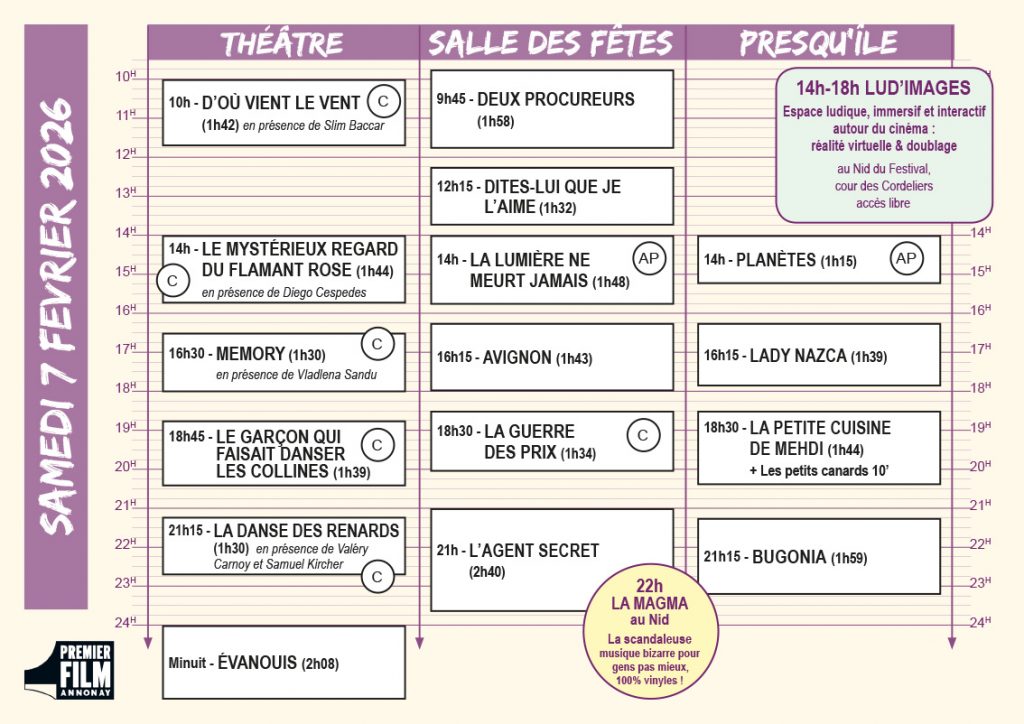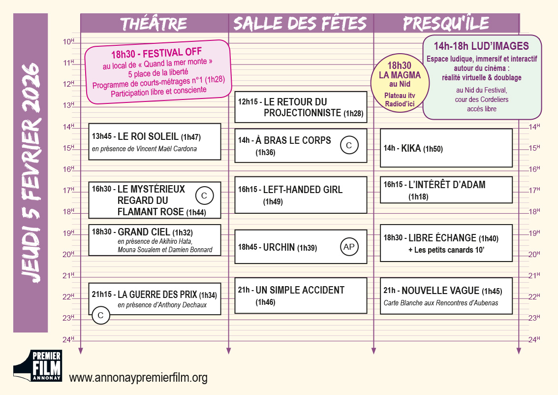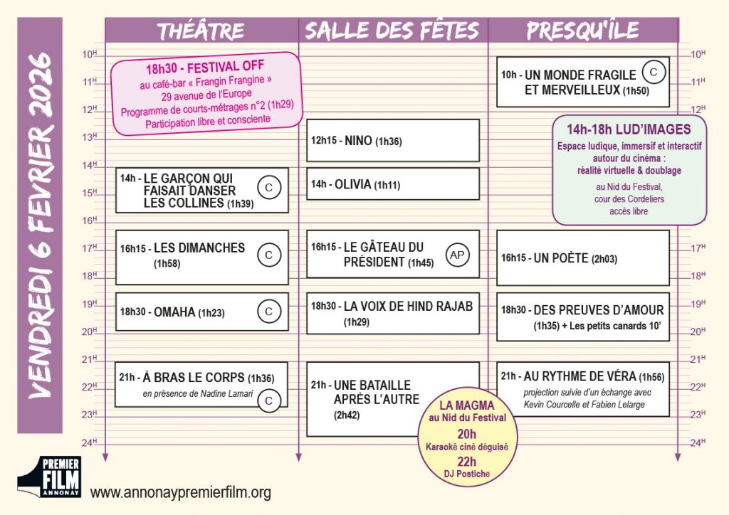 Vous en trouverez une version papier dans les lieux de projection et au Nid du Festival dans la cour des Cordeliers jouxtant le théâtre, elle permet de visualiser en un coup d’œil la programmation du jour !