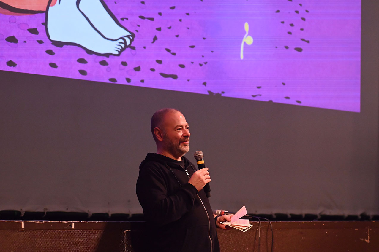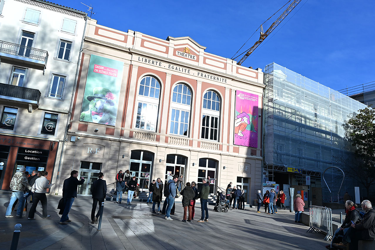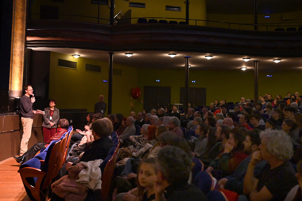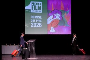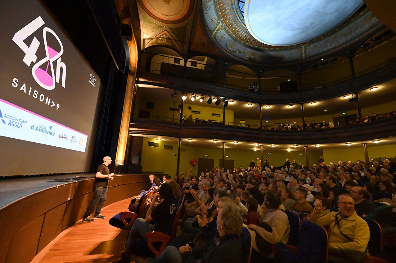 La veille de l’ouverture officielle du Festival, à 14h au Théâtre, pour les lycéens, lycéennes, mais aussi le tout public, était proposée une conférence de Fred Multier sur la création d’un film d’animation 3D, suivie d’un échange avec directrices et étudiante de l’ESMA, Ecole Supérieure des Métiers Artistiques (exposition visible au 1er étage du Théâtre). Le soir, dans le cadre de la programmation culturelle Annonay Rhône Agglo – En Scènes, un ciné-concert était présenté par le Collectif de l’ARFI, Association à la Recherche d’un Folklore Imaginaire. 14 musicien·nes accompagnaient avec panache LE MASQUE DE FER, film de 1929 dans lequel il est question des 3 mousquetaires, de D’Artagnan, du roi… et d’un masque de fer !