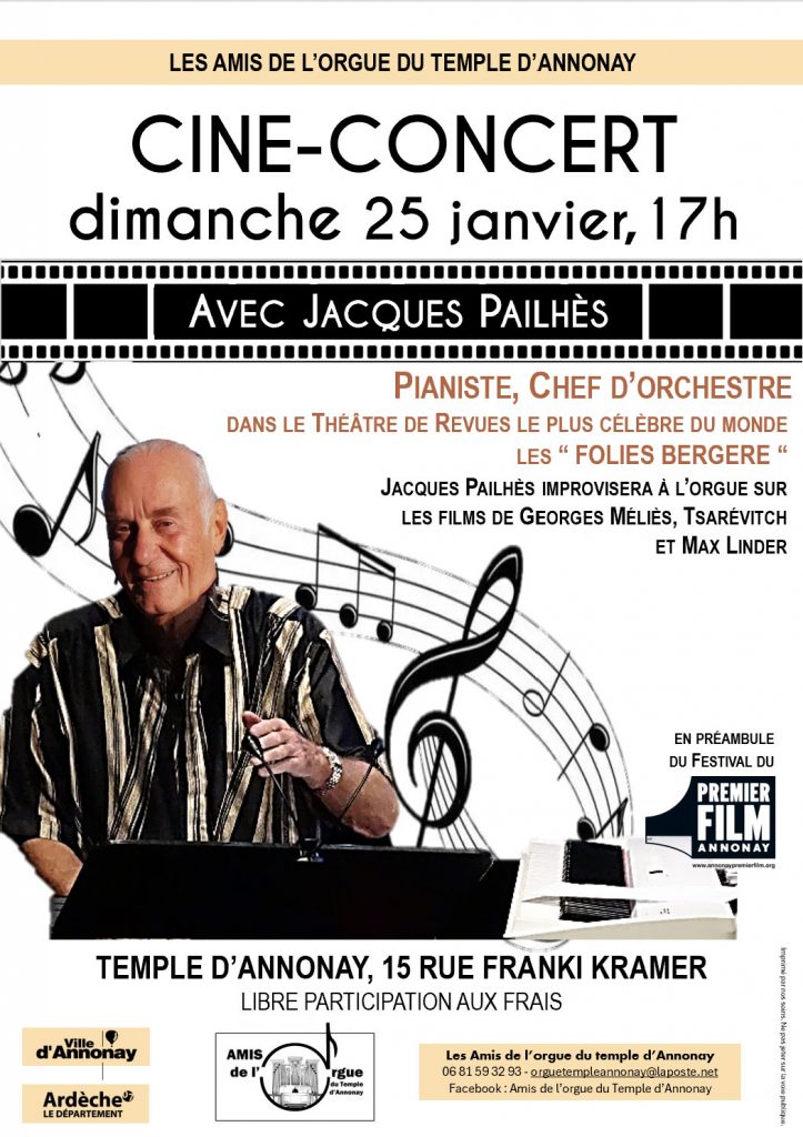 Jacques Pailhès, pianiste, chef d’orchestre, éclectique, a accompagné avec passion ces trois auteurs de cinéma en improvisant ses musiques, en France et dans le monde entier, au piano. En avant-première du Festival du Premier Film, Jacques Pailhès improvisera à l’orgue sur les films de ces trois cinéastes.