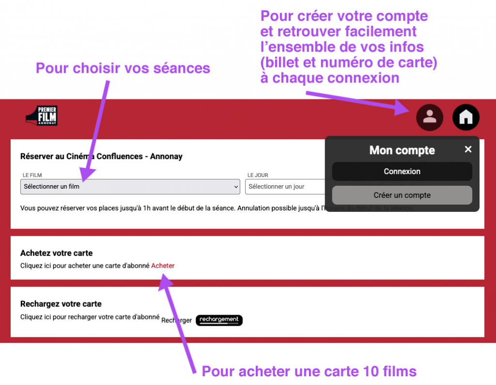 Vous trouverez ci-dessous un petit mode d’emploi, pour créer votre compte, choisir vos séances, acheter une carte 10 entrées. ATTENTION : la carte seule ne permet pas de rentrer en salle, il vous faudra un billet pour la séance (réservation internet ou ticket récupéré au Théâtre).